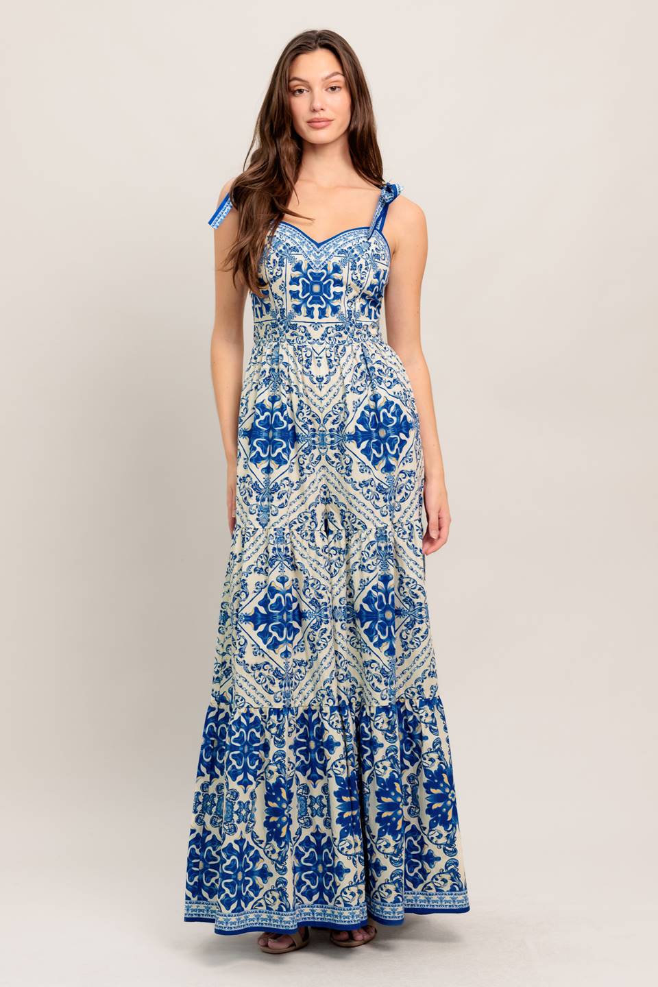 A printed woven jumpsuit featuring sweetheart neckline, shoulder tie, tiered pant and smocked back bodice