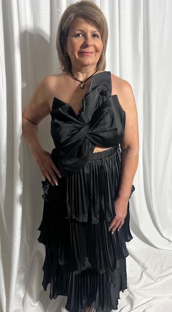 Studio Strut and Bolt Collection. Knot twisted long dress in satin fabric. This midi dress features an unique twisted and pleated bow at front, bodice with one shoulder construction with adjustable strap, smocking at back, pleated tiered midi A line ruffle skirt, side pockets, and cut out at front.